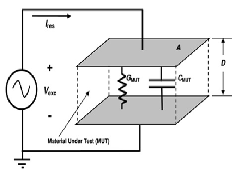 假設將材料製成一模塊,DEA儀器對其施加固定頻率的交流電壓,測量電極間的電導(G)和電容(C),可將材料建模為並聯的電容與電導。以下是導納(Y)計算公式: